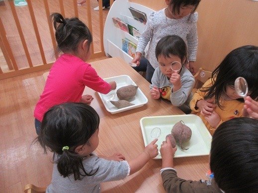 お芋さんってさ、おひげがあるね。それから 穴があいてるよ! 虫メガネを使って観察中です。