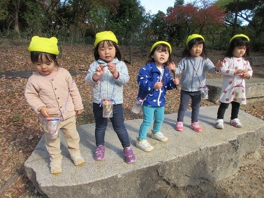 こちらはくまぐみさん。5日は初めての遠足に出かけました。水筒をななめにかけて、給食の先生が作ってくれたおにぎりを持ってワクワクしながらやってきたところは『二本松公園』