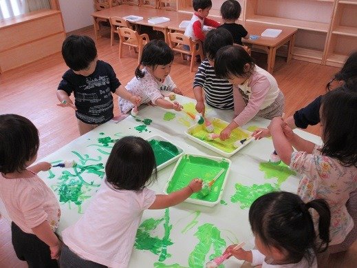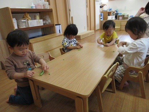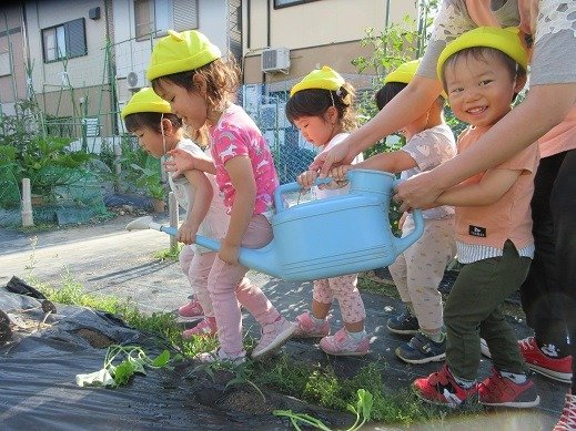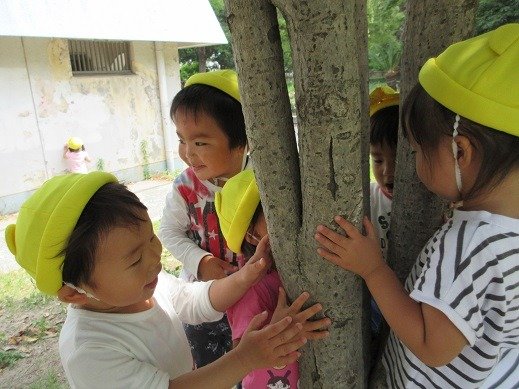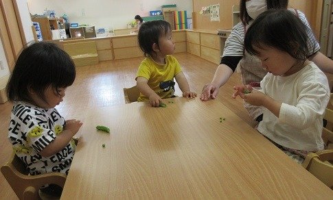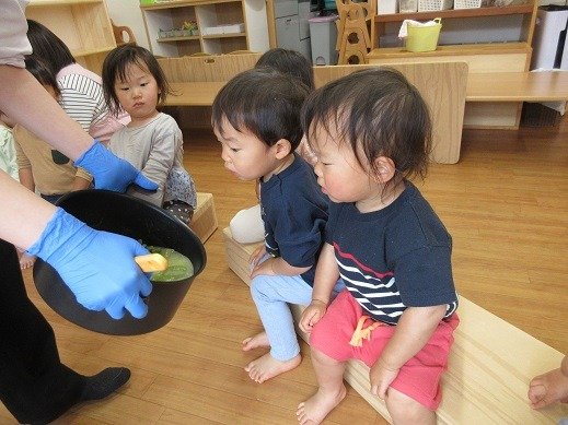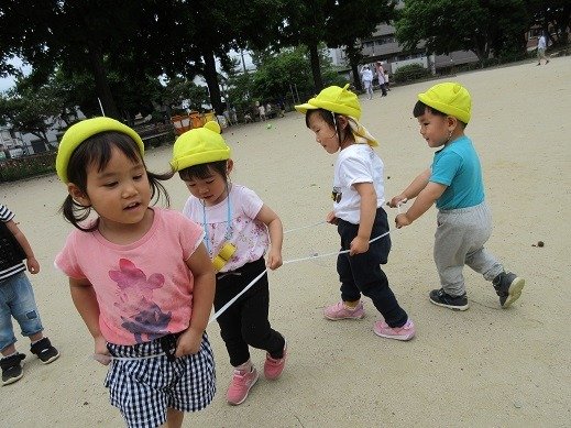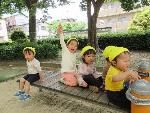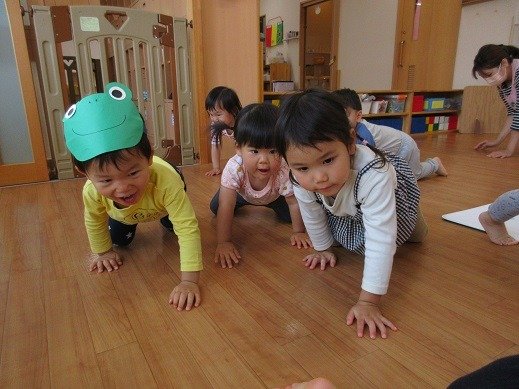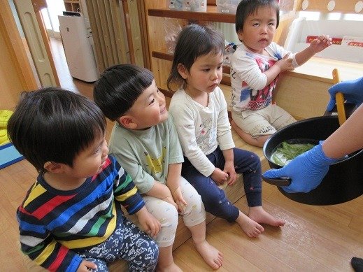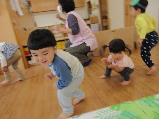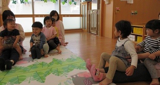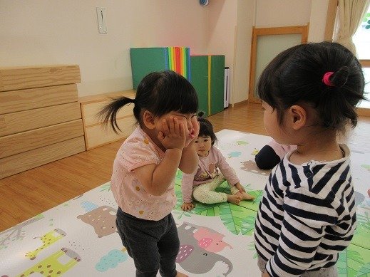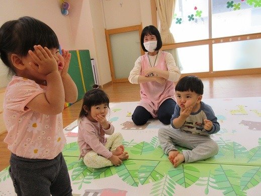 それを見て お友達も真似っこです。ほほえましい姿に先生もニッコリ。周りの子ども達もニッコリ。子ども達の言葉、体、心の発達にもよいとされるわらべ歌遊びですが、お友達同士の関わり合いにも一役かってくれています。