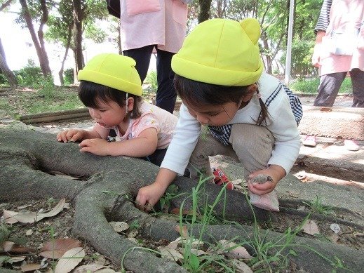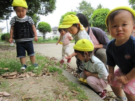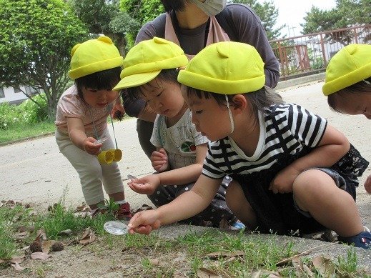 「虫がいた!」の声を聞きつけると、みんなが急いで集まってきます。ダンゴムシ?ありさん?なんていう名前の虫だろう?