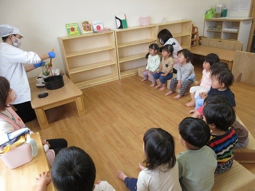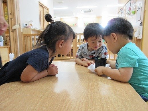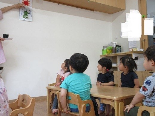 絵本『ひまわり』を見ながら、今はこの小さな赤ちゃんでね、どんどん どんどん大きくなって、こんなに大きな花が咲くことをお話してもらうと「うわー--!!」と手をたたくお友達も。大きく育つといいね。もう少し大きくなったら畑に植える予定です。