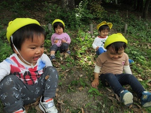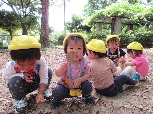 葉っぱ見つけたよ。みんなそれぞれいいもの探しに夢中です。