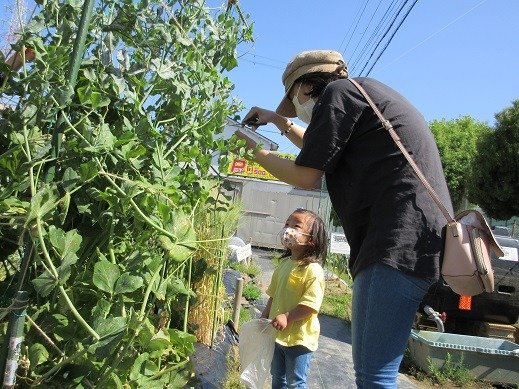 スナップエンドウもたくさんできたので、少しずつですが収穫体験をしました。私も食べてみましたが、とっても甘くておいしかったんですよ。