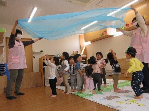 ふわふわの大きな布を使って♪うえからしたから~♪と布をあげさげ。子ども達がキャッキャッ!大騒ぎ。子ども達の柔らかい髪の毛がふんわり~ふんわり~と風に揺られます。大きく手を伸ばしたら届くかな?