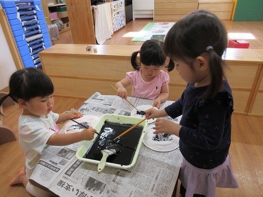 紙皿に黒の絵の具を塗りました。みんなの大好きなダンゴムシを作っているようです。きっと個性的なダンゴムシができあがるでしょうね。楽しみにしていましょうね。今週も元気いっぱい過ごせました。来週はお楽しみ会もありますよ。また元気に登園してきてね!