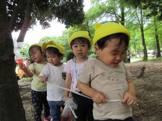 お友達と遊ぶのが楽しいな♪という意識が育ってきたくま組さんは、うさぎ組さんと手をつないで散歩にでかけ、兄弟姉妹のように遊んでいます。たのしそう!