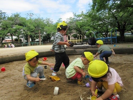 暑い日はお水を使って、どろんこ遊び。靴も服も泥だらけで、お洗濯は大変だと思いますが、子ども達が得たものは大きい!