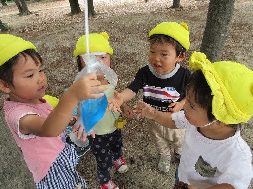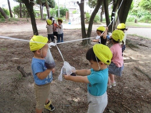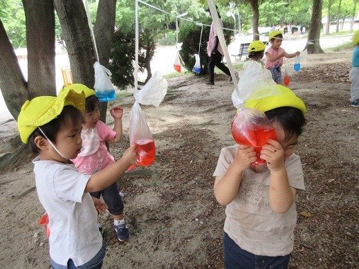 暑い日は公園の木陰を選んで遊んでいます。色水の袋をぶら下げてみるとムニュムニュ触ってみています。