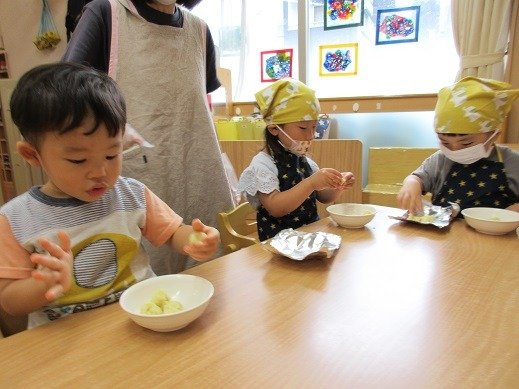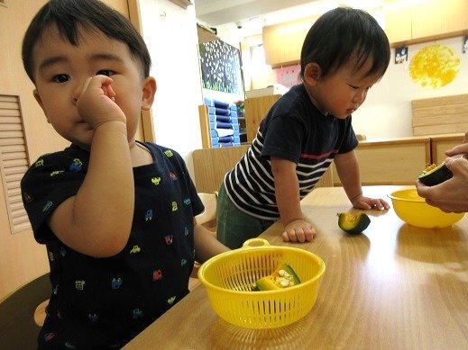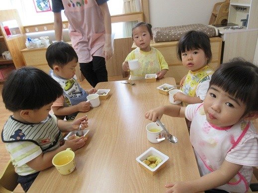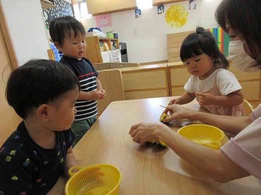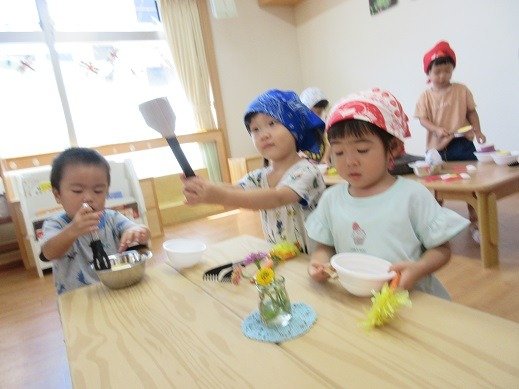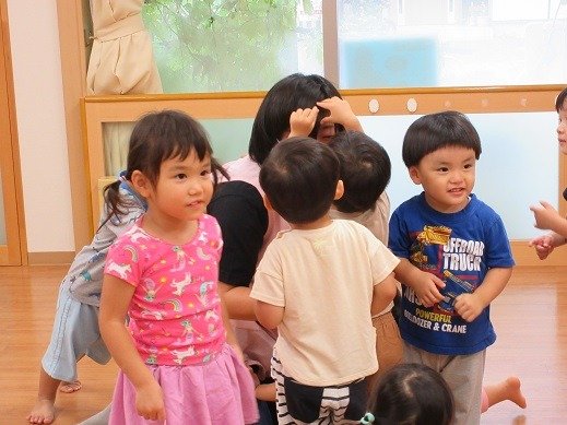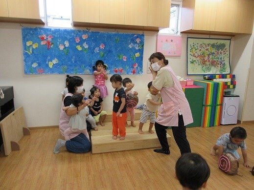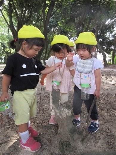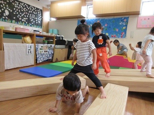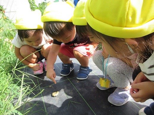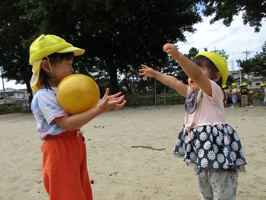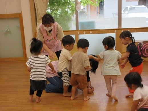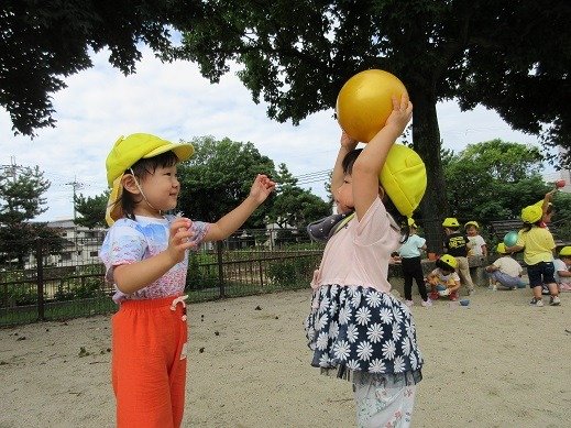暑い日は水遊びも取り入れつつ、これからは公園で遊ぶ日が増えていきます。いっぱい走って、のぼって、とんで・・・たくさん遊びながら、自分の体の使い方を知ってほしいと思います。元気いっぱい遊ぼうね!