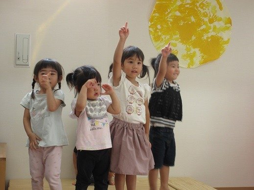 今月の体操は”めっちゃ元気体操”で。♪め~っちゃげんき め~っちゃげんき 1・2・1・2♪と、頭に残る音楽です。体操の音楽が始まると、舞台の上にささっと集合。みーんな、きらきら保育園のアイドル!今日も元気、元気 笑顔も素敵できらっきらです。