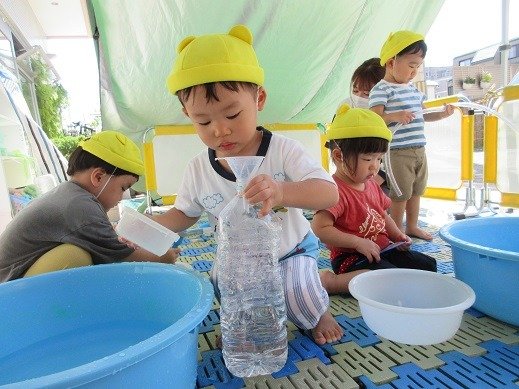 水遊びをいっぱい楽しんだ8月には、細いホースやペットボトルに水を入れたいと思ったら、じょうごを持ってきたり、スプーンを使って、そーっと流し込むことができるようになりました。