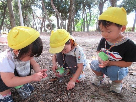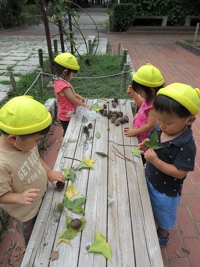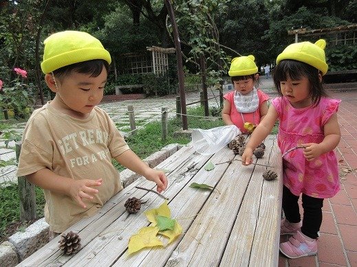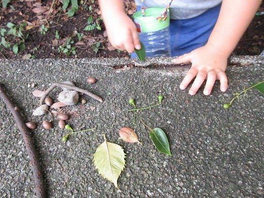 公園に行くと、子どもたちが大好きな木の実や葉っぱを集めてお店屋さんが始まりました。