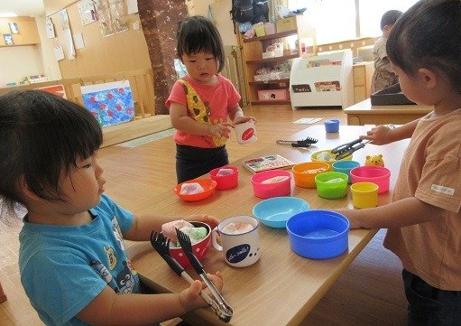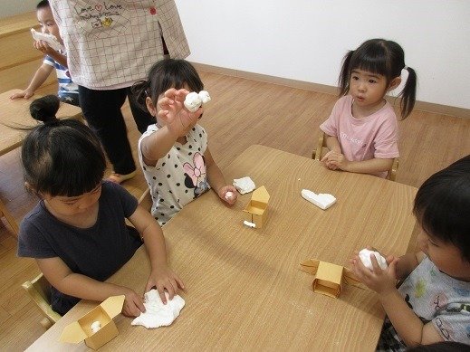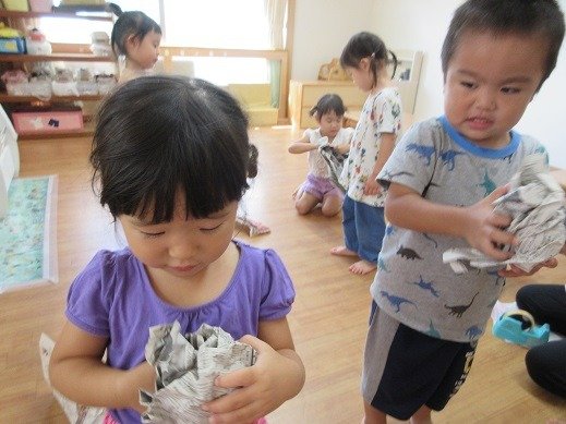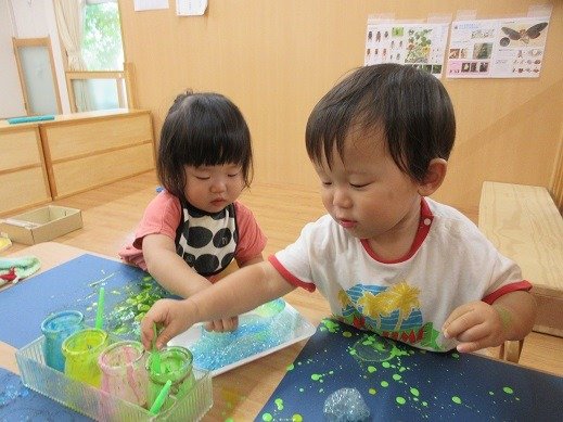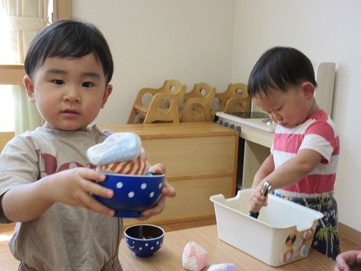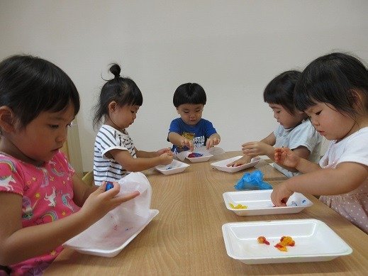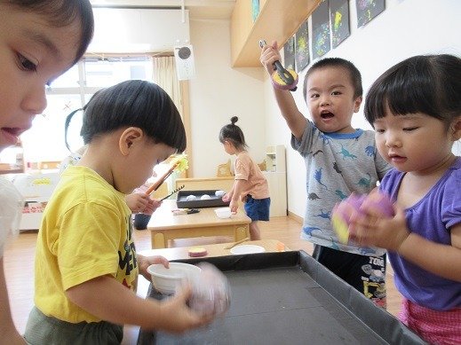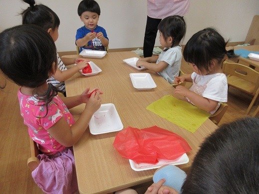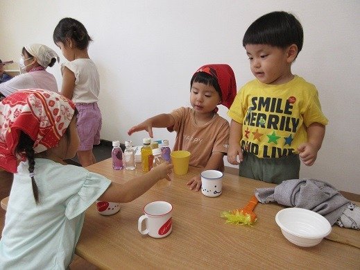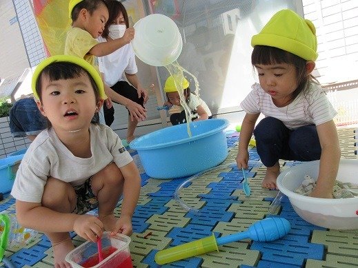 たくさんの素材を使って水遊びを楽しんだよね。この間は、お花紙を使ってみたら、トロトロになって楽しかったので