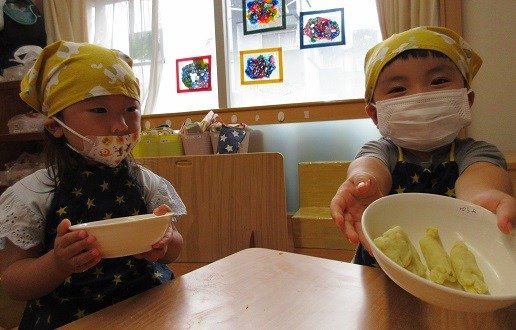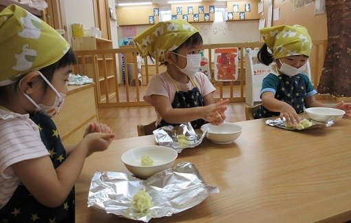 お月見の日は、お月見団子を作りました。初めてのクッキングです。