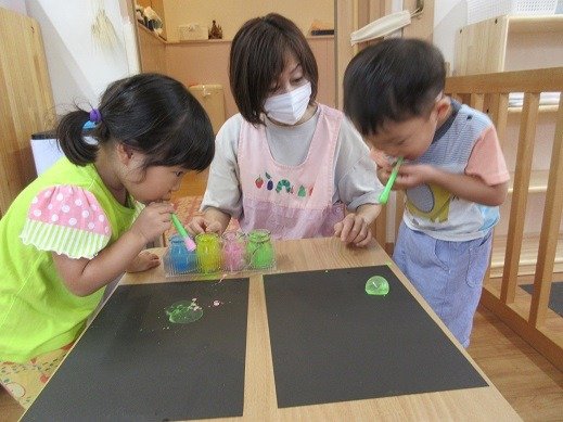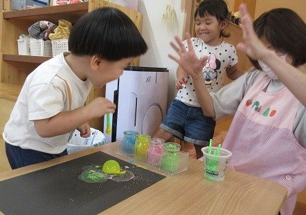 ぶぶぶぶぶ~っ! たくさんの泡ぶくや、周りに飛び散った絵の具で大笑いです。楽しくってもっとしたーい!