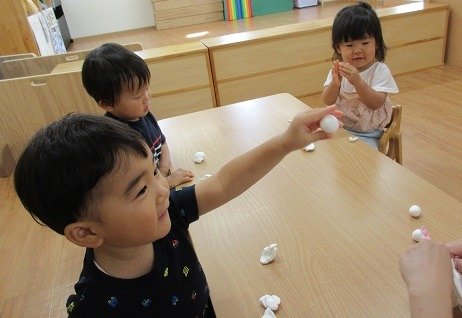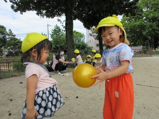 「ぽ~ん」投げているようですが、「どうぞ」と、渡しあいこしているんですよ♡ 微笑ましいやりとりに、そばでみていた先生はとっても癒されたようで、「もうね~ほんと、かわいかったんですよぉ~」と、トロットロの目をしてその時の状況を話してくれました。