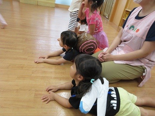 「大丈夫?」とっても優しい子ども達。最後は、魔法でオオカミにされていた先生にむけて、元気な体操パワーを送り、ハッピーエンドに終わりました。めでたし めでたし。