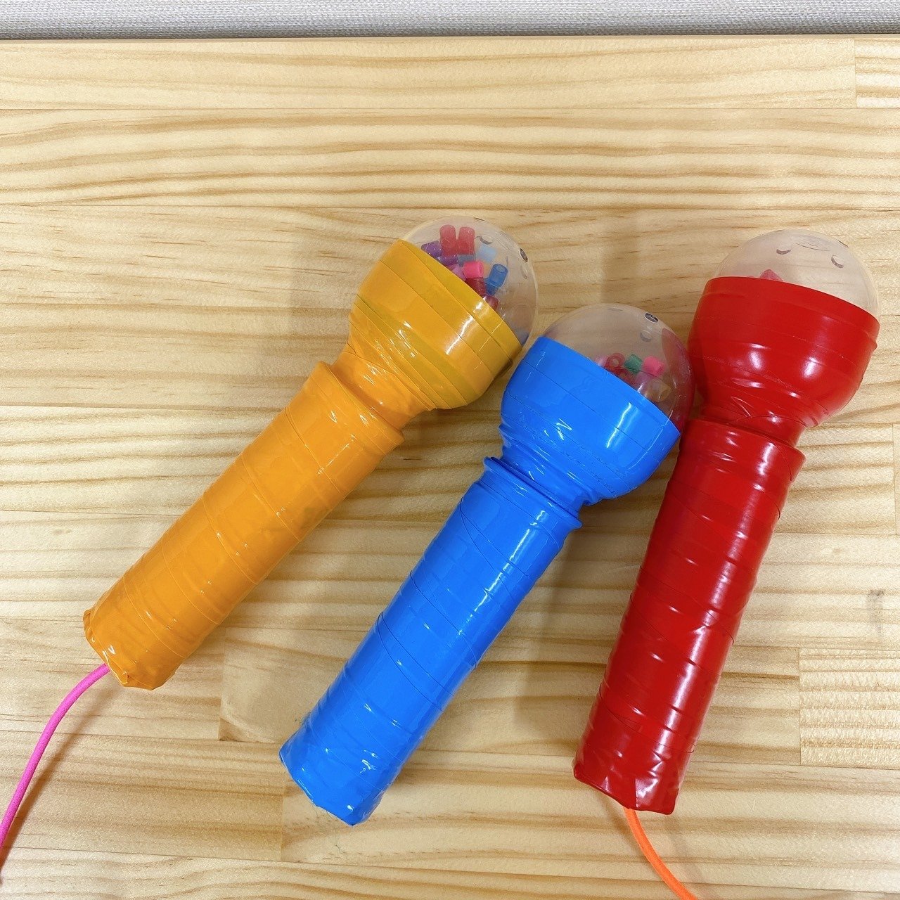 舞台の上で歌を披露してくれるようになったので、マイクを作りました。ガチャガチャとトイレットペーパーの芯でね。