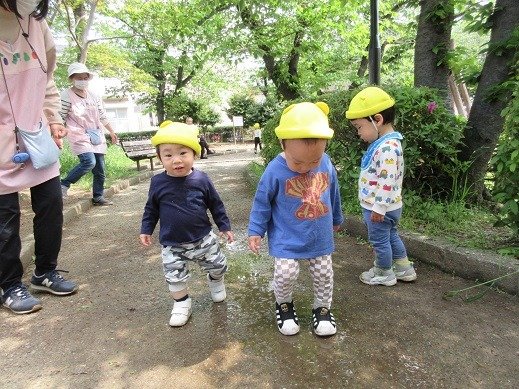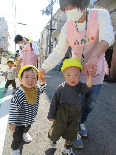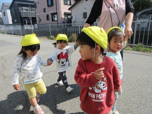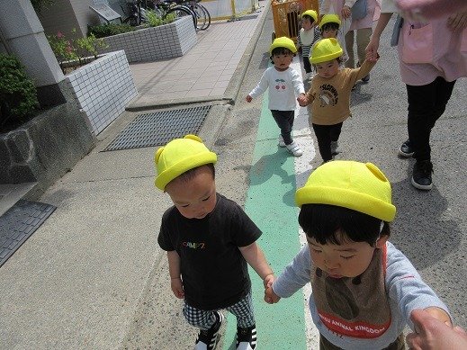 お天気が良い日はお散歩へ。ほら、お友達と手をつないで歩けるようになりました!感動~っ!子ども達のもっている力に感動させられる毎日です。
