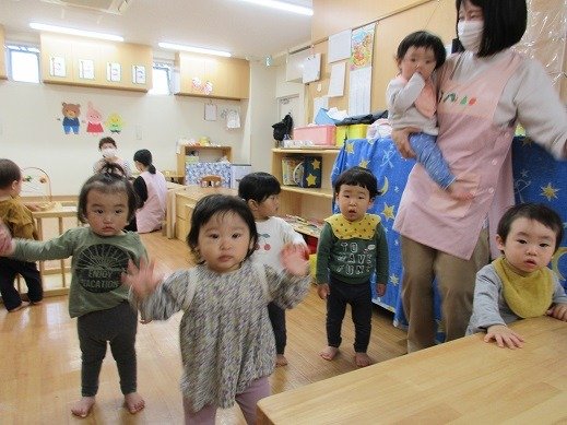 手でつかんでお口へパクッ。「できたね~。おいしいね~」おいしそうに食べるお友達に拍手。先生の真似っこをして、両手をパチパチ。真似っこもできたね!すごいすごい!とまた拍手♪
