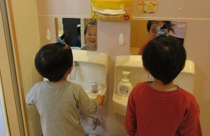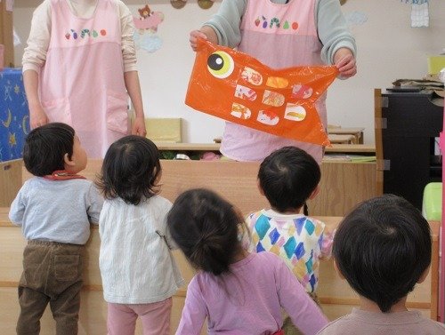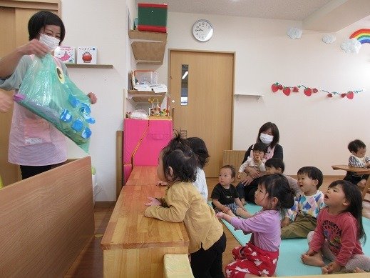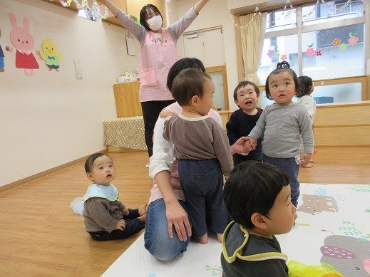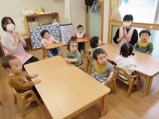 入園から3週間がたちました。おやつの前には椅子に座って、絵本をみたり、お歌を歌ったり、こんなことができるようになりました。みんなすごい!
