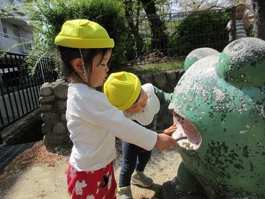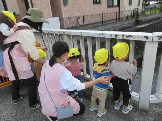 カモの赤ちゃんを見つけました!お散歩にでかけると、大きな魚や亀にも出会えるんですよ!また今度も会えるといいね。「カモさんばいばーい」手を振って保育園に帰ってきました。