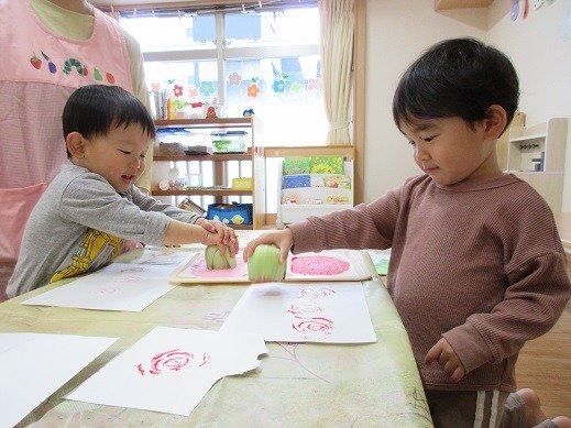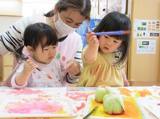 青梗菜の根元を使ってスタンプ遊び。ぎゅーっと押すと、〇〇の形!これで可愛らしいものを作りますよ。