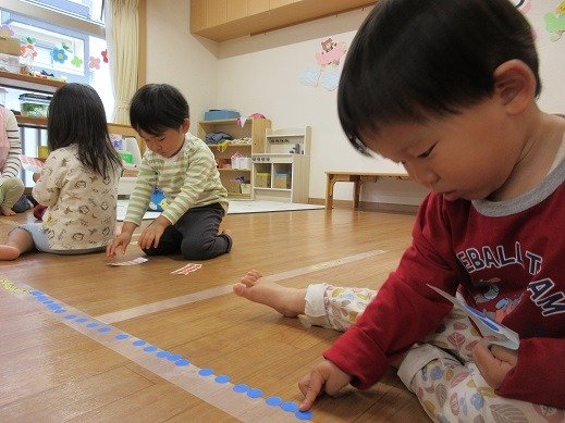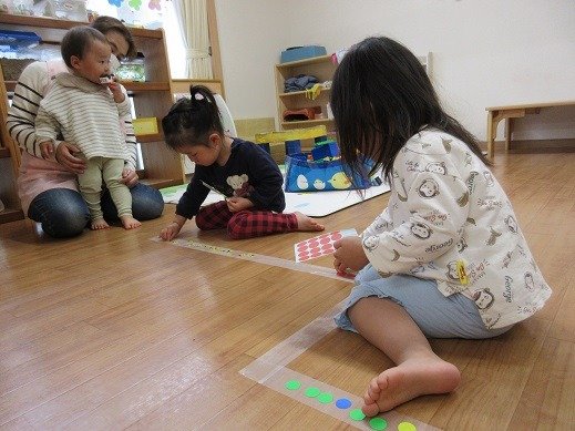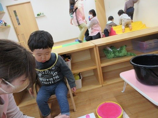 くま組さんはシールを出すと床に貼ったテープにペタペタ。それを見たうさぎ組さんも真似っこしてペタペタ。くま組さんは、泣いているお友達のことを気にかけて、すっかりお兄ちゃんお姉ちゃんの顔を見せてくれています。