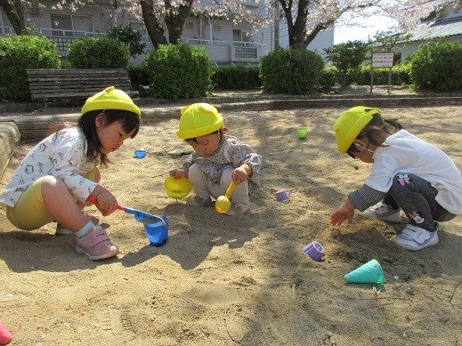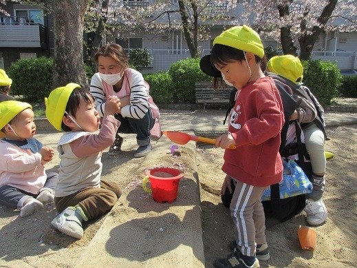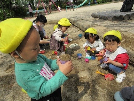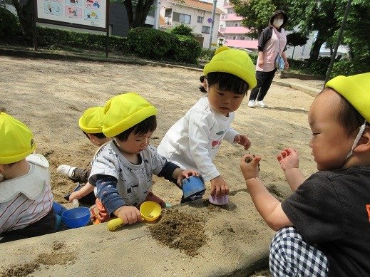 砂場に集まって、くま組のお兄ちゃんとお姉ちゃんが優しく遊んでくれます。