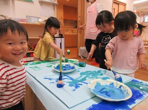 それから絵の具もしましたよ!「みて!立った!」笑 おもしろいことに気が付いたね。色の混ざりがきれいだったのも見つけましたよ。