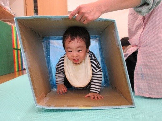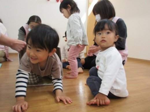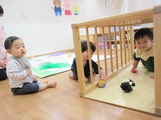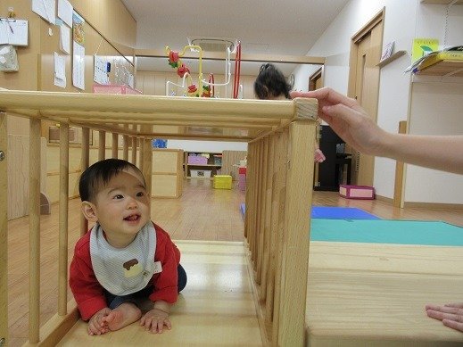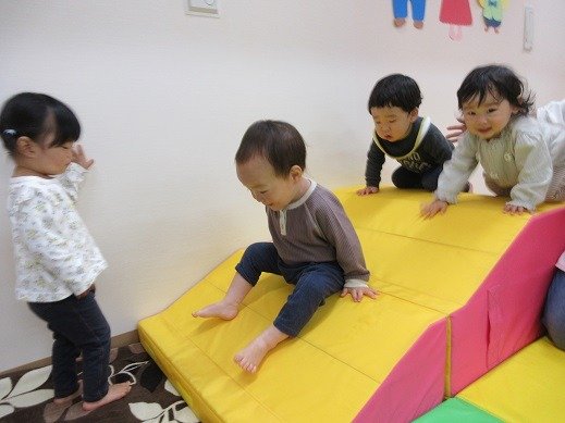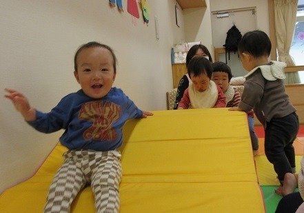 ひよこ組さんは、いっぱいハイハイができるようにと広げたマットのお山をヨイショと乗り越えてころり~ん。すべり台が大好きなうさぎ組さんはシュッ!ひよこ組さんもチャレンジしていますよ。