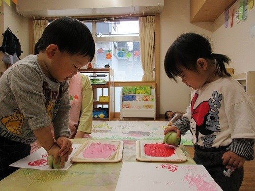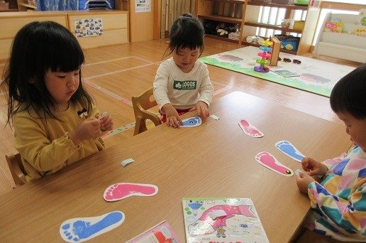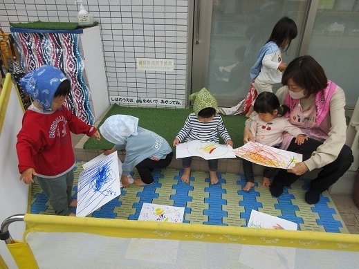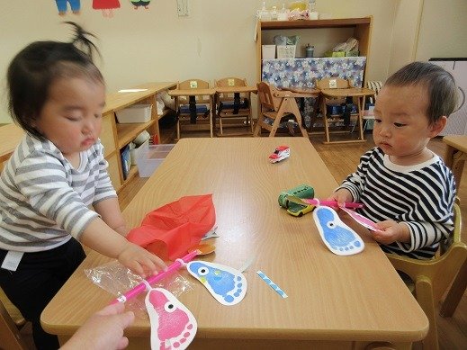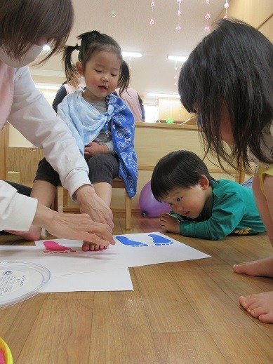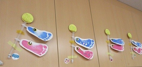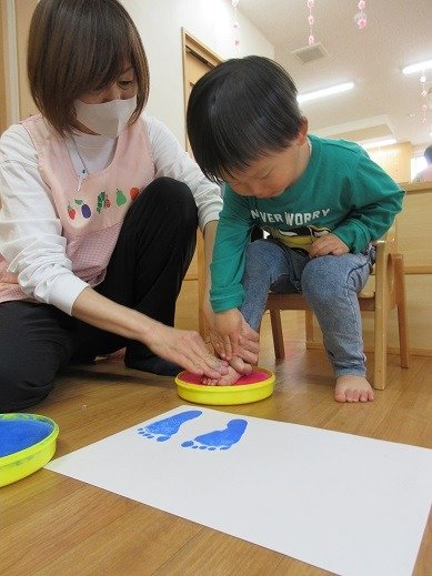 それから 足型もとりました。なんと!新しいお友達も足に絵の具がついても、だ~れも泣かずにできたんです!