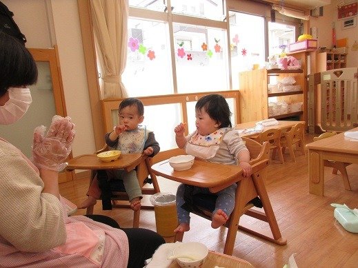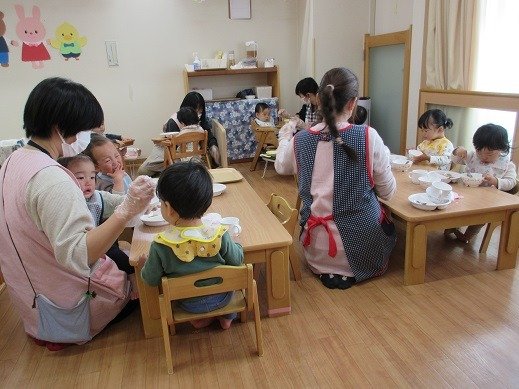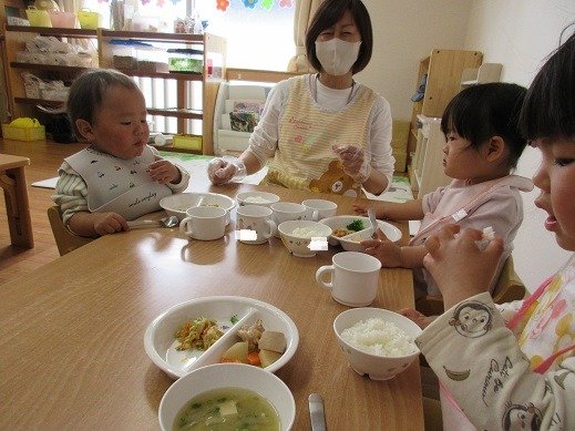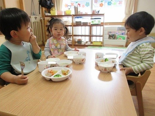いっぱい遊んだのでおなかもぐ~っ。うさぎ組さんとひよこ組さんにとっては初めての給食の日の写真です。「おいしいね」と言いながら、しっかり給食も食べれました。