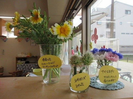 玄関先には卒園したお友達が買ってきてくれた花がたくさん咲いて、今が見ごろ。お部屋にもお花を飾って、子ども達と「かわいいね」とお話をしながら見ています。