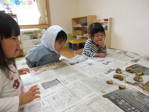 「つのいちさん おったよ!」くま組さんにとって、カブトムシは『つのいちさん』なんです。カブトムシの幼虫がケースの端っこにいてよく見えました。蛹になるのは まだなのかな?図鑑を広げて調べました。