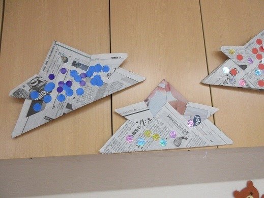 足型で作ったこいのぼりに目をつけました。どこにつけようかな~迷いながら目のシールを貼るお友達や、はがすのがおもしろくて何度も繰り返して、やっとできたこいのぼりには目がなかったり 笑