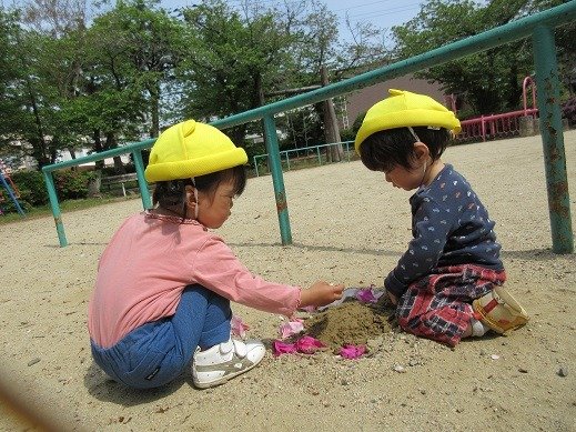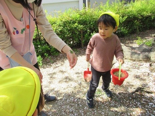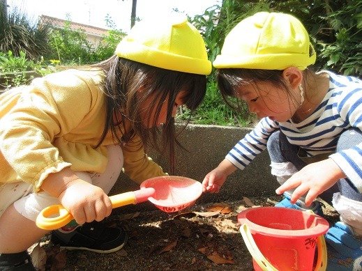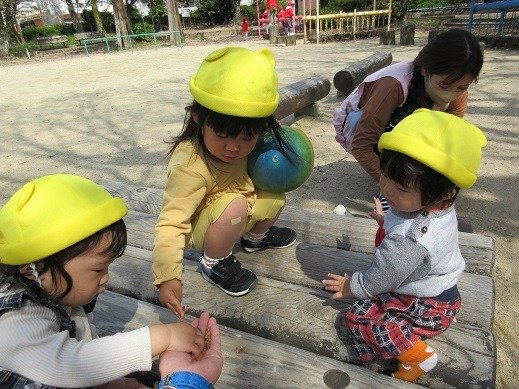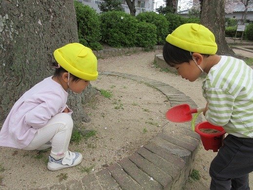 「ほら!ありさんがいるよ」「お砂入れたげよか?」