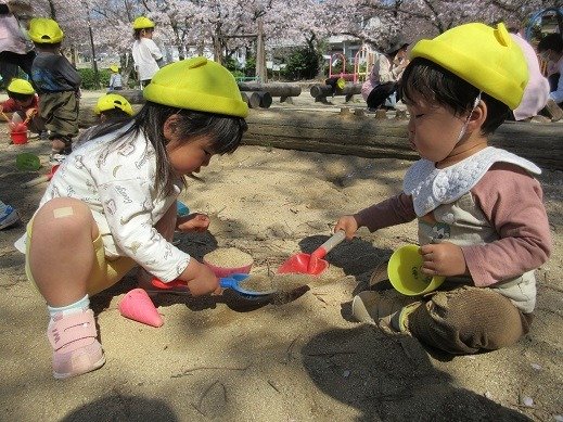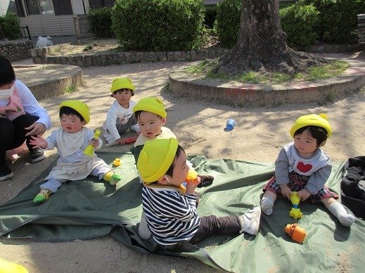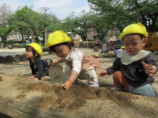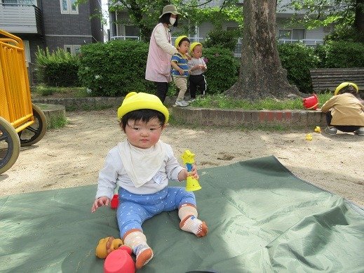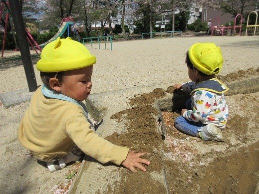 ひよこ組さん達は桜の下で気持ちよく過ごしました。そのうち砂場の方までハイハイをして砂の感触も確かめています。