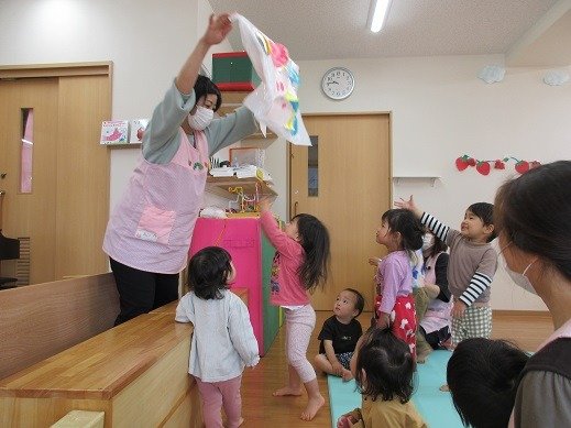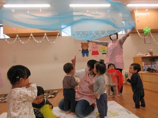布遊びも大好きみたい。わらべ歌をうたうと、泣いていたお友達もじーっと聞いてくれたり、絵本を読んであげるとページをめくってくれたり、歌をうたうと手をパチパチしてくれたり。先生達もこれ好きかな?こっちはどうかな?子ども達の様子をみながらの1週間。