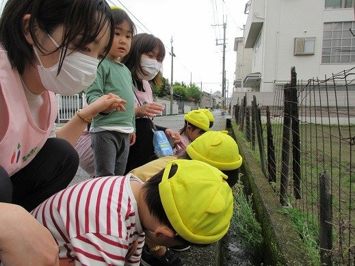 雨がやんだので、保育園の前の溝を覗いてみました。だってね、さっきカエルの声が聞こえたんですって。(雨の音だけじゃなかったみたいですね)いるかなぁ?キョロキョロと探してみました。