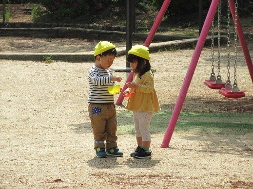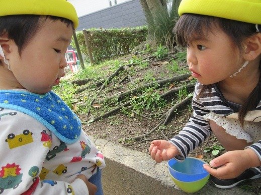 公園では、くま組さんもうさぎ組さんもひよこ組さんも、自分の好きな遊びを楽しんでいます。いいものを見つけたら「赤ちゃんにも見せたげる」と持ってきてくれたり