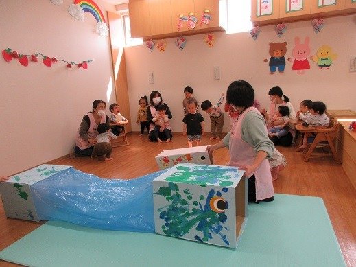 もっと大きなこいのぼりが登場!トンネルになっています。「準備をする間、壁にくっついて待っててくれる~?」と先生の声に、みんな壁にペタン。ちゃんと待っていてくれました。