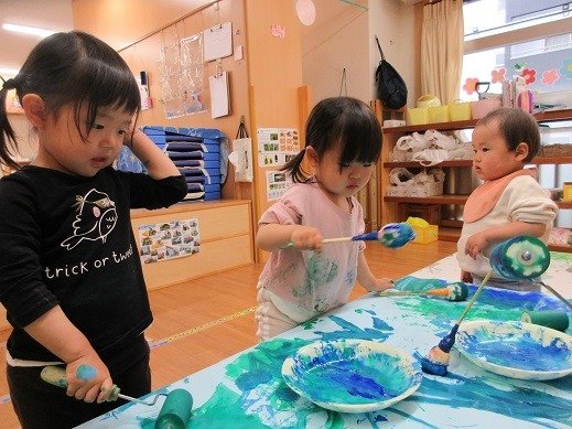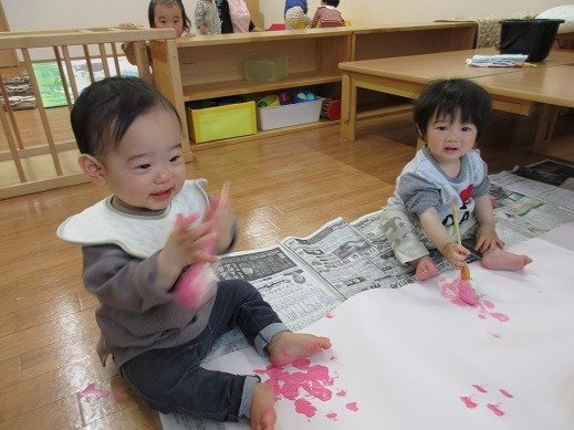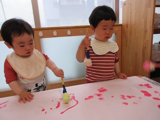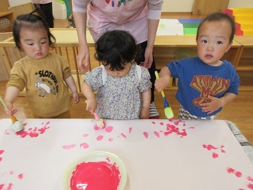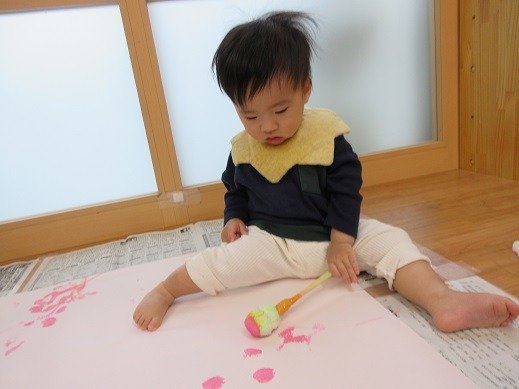 初めての絵の具遊び。ポンポンと色が付くのが不思議そう。手のひらにもつけてお顔にもぬりぬり。カメラを向けるとニカッ!と笑って見せてくれました。お化粧したみたいね。