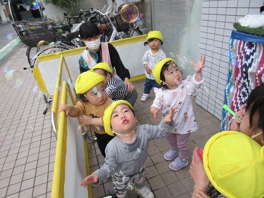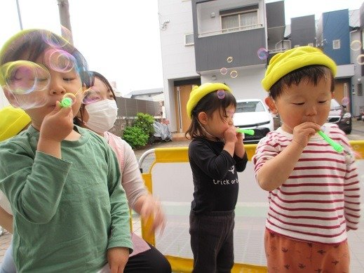 ほしグループさんも、気分転換に外でシャボン玉。たくさんのシャボン玉に、両手をいっぱい伸ばして捕まえようとしていましたよ。くま組さんは自分でフー。空に消えていくシャボン玉をみんなで見上げました。