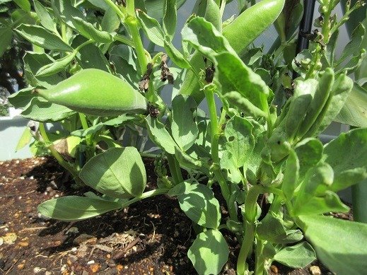 ソラマメはあまり大きくなりませんでしたが、玄関先のプランターで育っていますよ。見つけられるかな?
