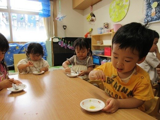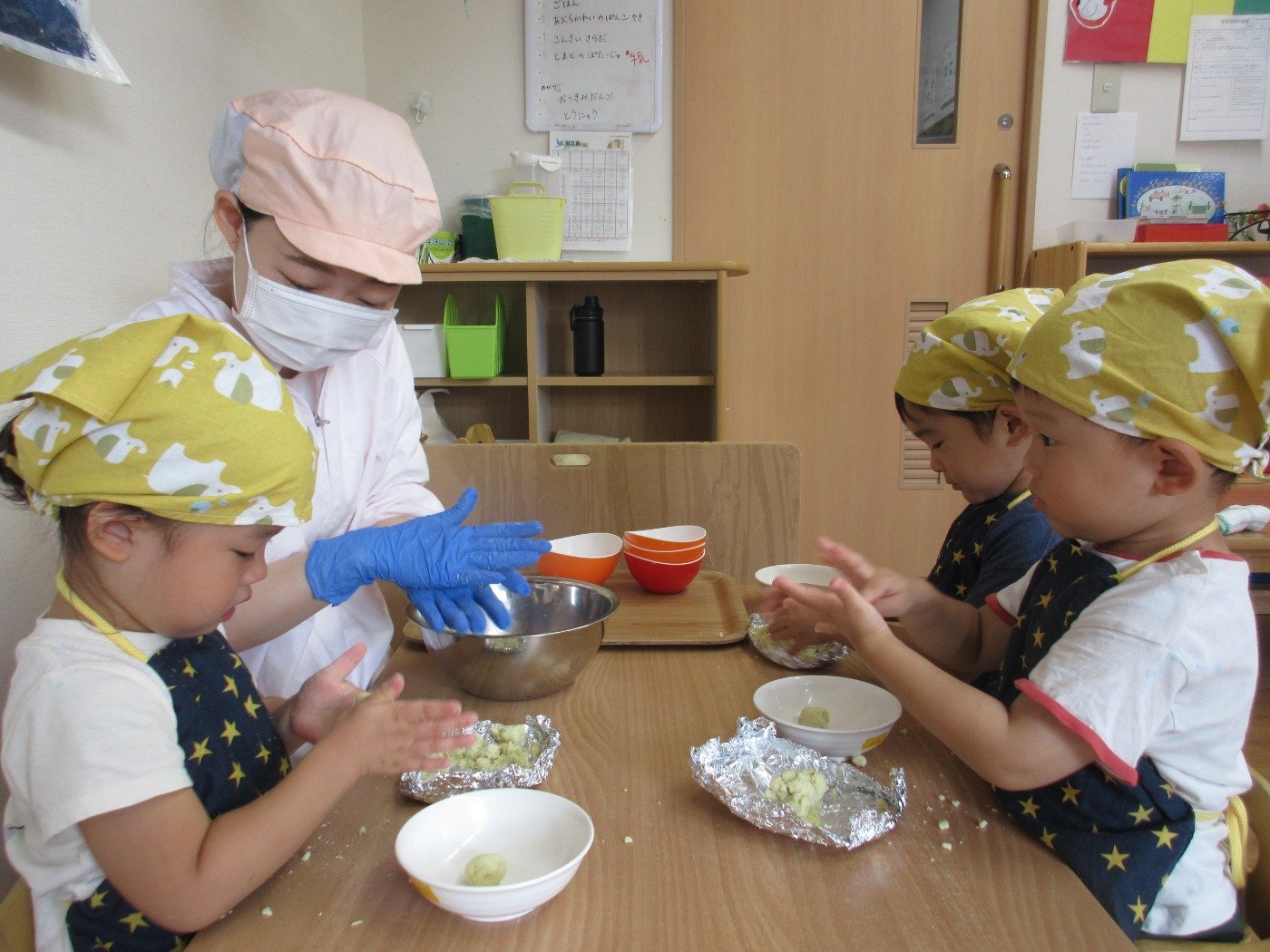 くま組さんはお月見団子を作りました。サツマイモと豆乳を混ぜたものを手のひらでクルクル転がして、まんまる団子が完成!焼いて甘辛いみたらしのあんをかけて3時のおやつでいただきました。サツマイモの甘味が優しいおやつです。