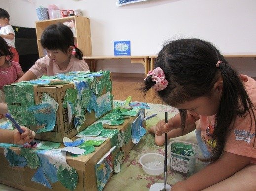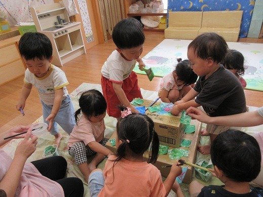 絵の具遊びをした紙をペタペタと貼り付けておみこしを作っています。