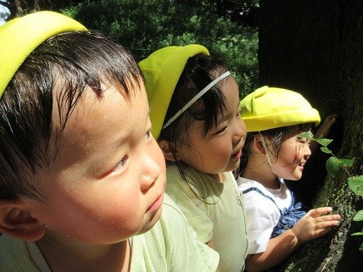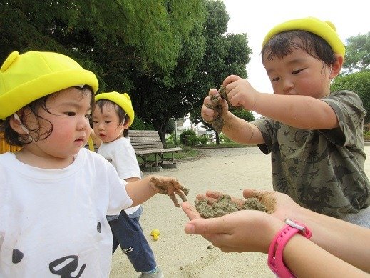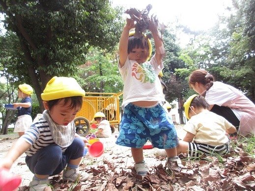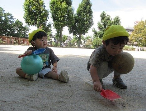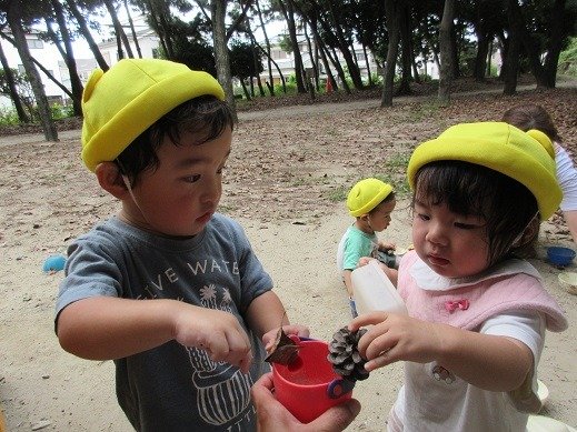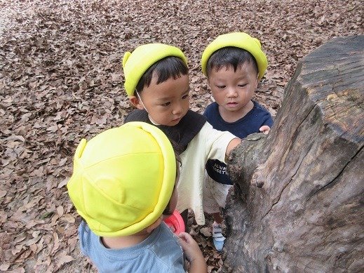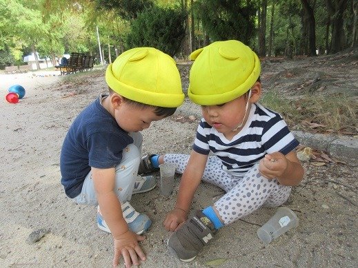 木の根元や、木にあいた小さな穴、土の穴を見つけると「なんかおるかもしれん」と覗き込みます。ごっつんこするぐらい頭を寄せ合って木の棒でつついたり、スコップや入れ物をもってお宝発見に、鼻をプクプクさせています。
