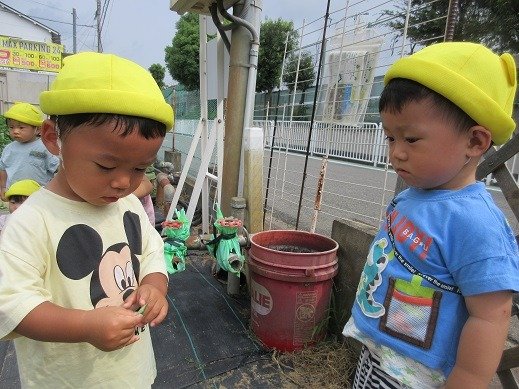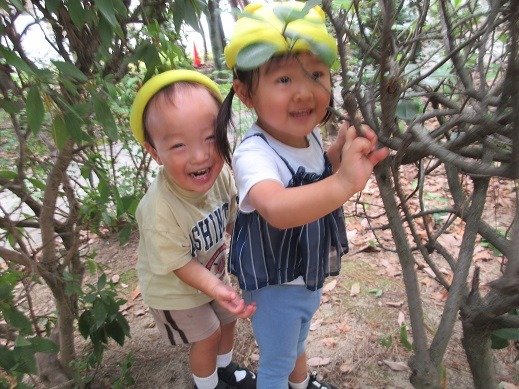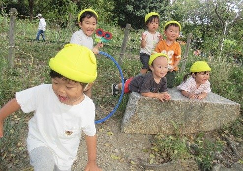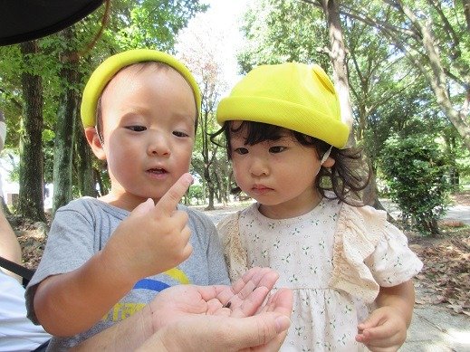 「みて~捕まえた!」すいすいと捕まえるくま組さん達に影響されて、うさぎ組さんもチャレンジ。かごにいっぱいバッタを捕まえて帰ってきました。秋ですね。