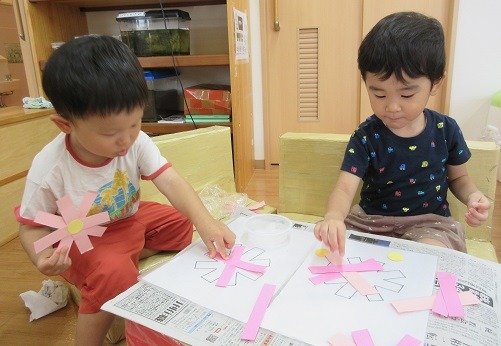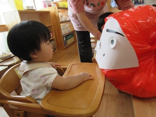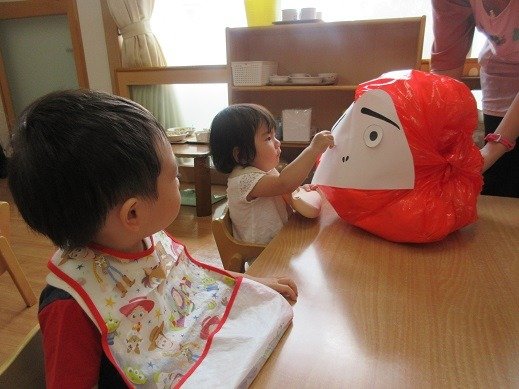 大好きなだるまさん♪お花紙で遊んだものをみんなで詰めて出来上がっただるまさんは、おみこしに乗せるようですよ。